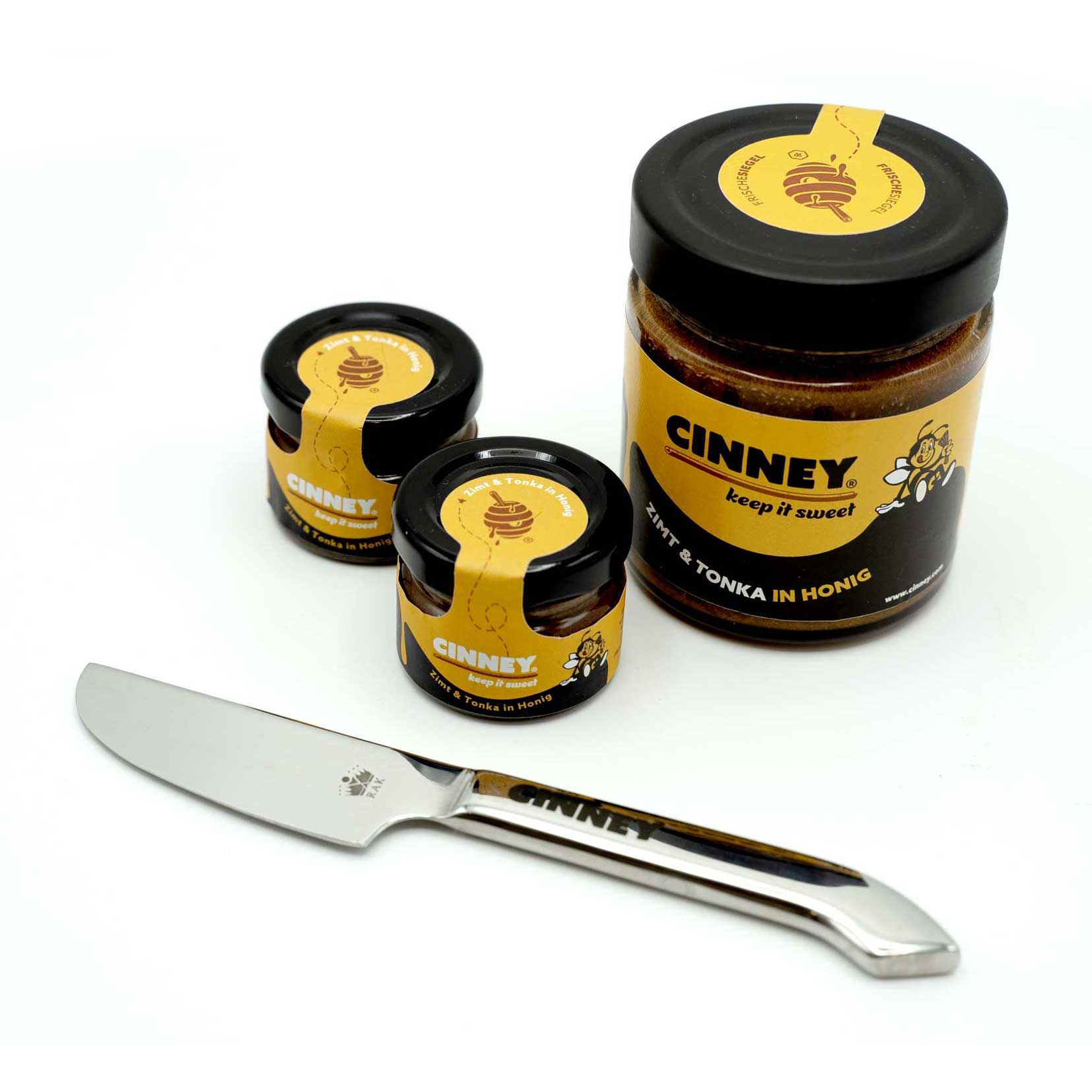 Das Set umfasst ein hochwertiges Aufstrichmesser, ideal zum Verfeinern Ihrer Lieblingsspeisen. Dazu erhalten Sie ein großes Glas CINNEY Honig mit 250g, das mit seinem einzigartigen Geschmack begeistert. Für die kleinen Genüsse gibt es zudem zwei Probiergläser mit je 25g, perfekt um es mit Freunden oder der Familie zu teilen.